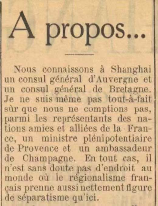In Shanghai, we have a consul general from Auvergne and a general from Brittany. I’m not even entirely sure that we don’t have, among the representatives of France’s friends and allies, a minister plenipotentiary from Provence and an ambassador from Champagne. In any case, there is probably no other place in the world where French regionalism takes on such a distinctly separatist character as it does here.”