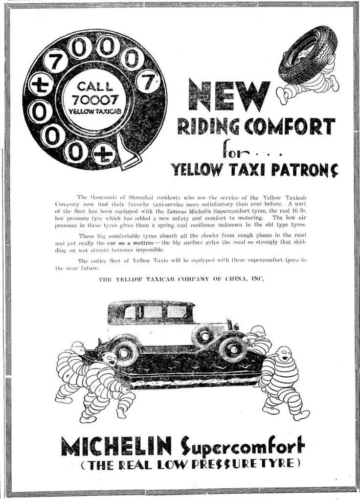 The address for the advertising for Michelin’s tire demonstration is, “Rue Bourgeat”, “Corner of French Club”. This is located at the corner of Changle Lu 长乐路 / Rue Bourgeat and Maoming lu 茂名北路 / Route Cardinal Mercier. It is opposite the former Cercle sportif Français (today the Okura Garden Hotel) with Cathay mansions (Today Old Jinjiang hotel) on the opposite corner. The fourth corner is occupied by Lyceum Theater. In the early 30s. this was one of the main spot of the French concession.