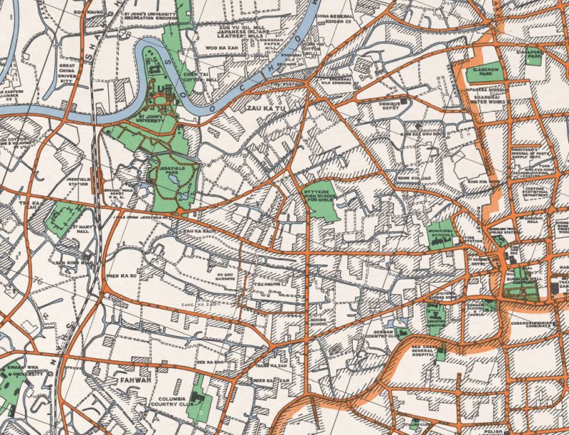 Comparing the 1937 British map and today satellite, it is clear that the area was surrounded by factories, in particular cotton mills. All those factories were using the river water and dumping used water in it. The Suzhou creek was not as clean and nice as today and sometimes had weird color due to textile dying process in the factories on its sides.