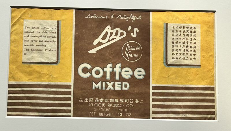 The coffee exhibition also displayed advertising for coffee brands from old Shanghai. This included the same “Max Well” branded menu from Royal Coffee shown in post “Shanghai Coffee Culture“. The 静安咖啡馆, Jing An Coffee shop was located on 1472 Bubbling well road, that is 1472 Nanjing Xi Lu / 南京西路 nowadays. It was the coffee shop of the CPC coffee brand. Office building United plaza is now on this location. This area of Jingan has many coffee stores, including some close to this original location.